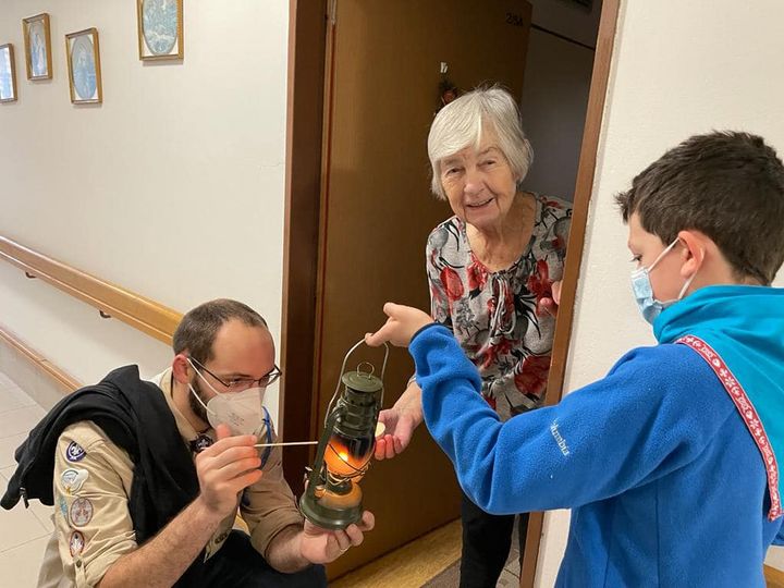 🕯🕯🕯🕯čtvrtou adventní neděli přinesli Hostivičtí skauti Betlémské světlo, ručně vyrobená přáníčka a perníky do domu s pečovatelskou službou.