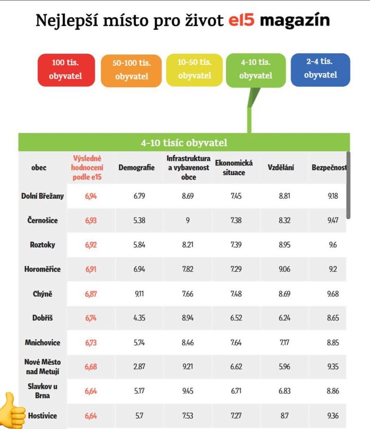 Magazín E15 nás zařadil mezi 10 nejlepších míst pro život v Česku. To je skvělá zpráva a důvod k hrdosti! Máme tu bezpečí, čistotu, kousek krásné přírody i dobrou dostupnost do Prahy.
