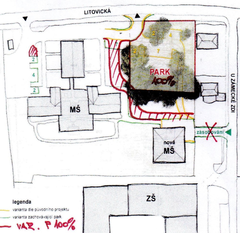 21/6 Proběhla schůzka jednoho z našich občanů, a „signatářů“ petice, stavebního inženýra Miroslava Vlka, se starostou Kratochvílem přímo ve školce. Z navrhovaných řešení se pan starosta přiklonil k níže uvedenému (viz plánek). Bylo přislíbeno, že nový projekt bude vyvěšen na web města. S napětím čekáme…