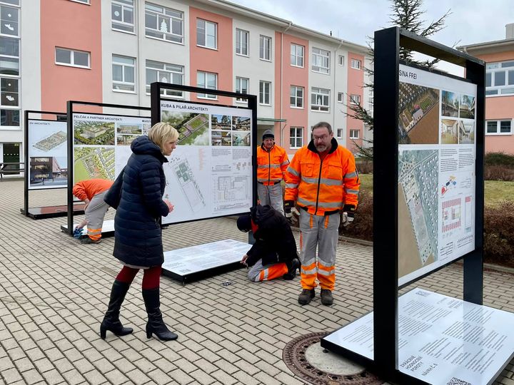 👩🏫👨🏼🏫🧑🏻🏫 Dopoledne jsem dohlížela na převoz výstavních panelů s návrhy nové svazkové školy, proběhla instalaci výstavy v atriu školy a v podvečer jsme čekali hosty. Přijeli organizátoři soutěže, její vítězové pánové Opočenský a Králík z ateliéru ov architekti, porotce David Tichý a sousedé z Chýně – starostka Anna Chvojková, zastupitelka Petra Vacková a 1. místopředsedkyně poslanecké sněmovny Věra Kovářová. K návrhu byla velice zajímavá diskuse. A tak je škoda, že zájem veřejnosti byl hodně malý.