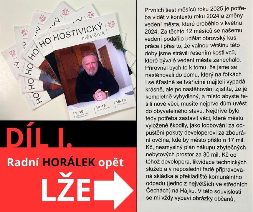 ‼️ DŮRAZNĚ SE OHRAZUJEME PROTI LŽIVÝM TVRZENÍM RADNÍHO HORÁLKA, která jsou uvedena v červnovém vydání Hostivického měsíčníku. Na jeho předchozí útoky jsme nereagovali, jelikož jsme nechtěli vyvolávat konflikty, které občanům nic nepřináší. ⚠️ Jeho výroky jsou však opakovaně nepravdivé, zavádějící a nepodložené fakty. Takové jednání je nepřijatelné, a proto musíme podniknout potřebné kroky k ochraně našeho dobrého jména i k uvedení věcí na pravou míru. Začínáme s postupným vysvětlením všech l...