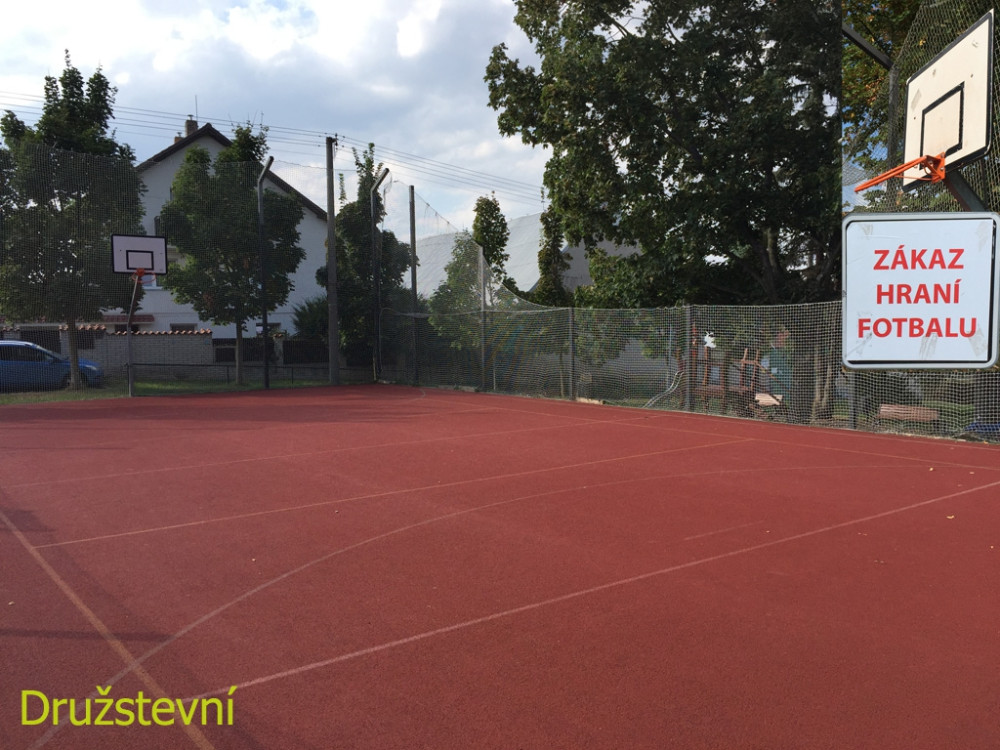 Naše řešení: 1) Instalovat kameru s napojením na městskou policii, 2) opravit basketbalové koše, přičemž zvážit možnost instalace košů z masivnějšího kovu, aby nedocházelo k jejich ničení, 3) instalovat menší branky (velikost cca hokejových branek) a jejich ukotvení pod basketbalové koše, aby nemohly být zcizeny a zároveň nemohly na nikoho spadnout, 4) předělat oplocení na pevnější síť nebo na klecové, 5) odstranit zákaz hraní fotbalu a změnit ho, s ohledem na povrch hřiště, na zákaz používaní kopaček s kolíky. Implementace tohoto řešení je možná takřka okamžitě s minimálními náklady.