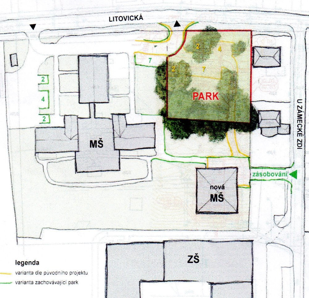 21/6 Proběhla schůzka jednoho z našich občanů, a „signatářů“ petice, stavebního inženýra Miroslava Vlka, se starostou Kratochvílem přímo ve školce. Z navrhovaných řešení se pan starosta přiklonil k níže uvedenému (viz plánek). Bylo přislíbeno, že nový projekt bude vyvěšen na web města. S napětím čekáme…