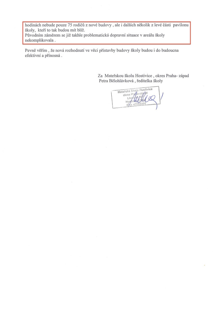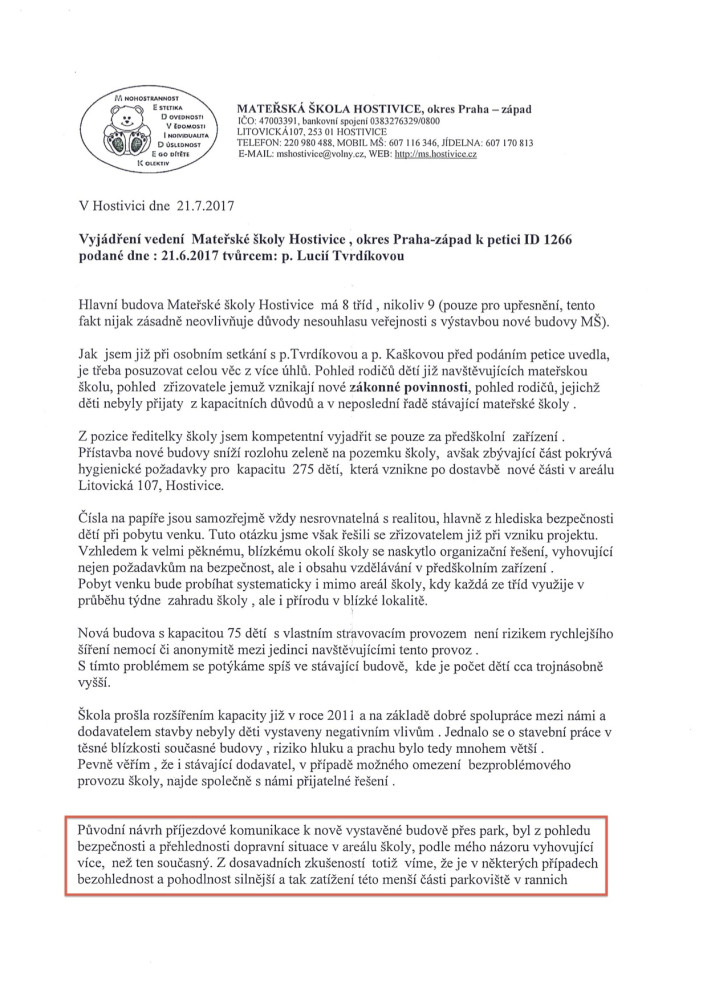 Před necelým týdnem jsme obdrželi vyjádření města k petici za záchranu parku ve školce. Pan starosta odkazuje na zářijové zastupitelstvo, které se k petici vyjádří. Paní ředitelka školky se vyjadřuje zevrubněji. Opravdu nás ale překvapil její názor, že původní řešení, které zabíralo polovinu parku pro parkoviště a příjezdovou komunikaci, bylo bezpečnějí než nový návrh. Posuďte sami, důležitou část jsme vyznačili červeně…